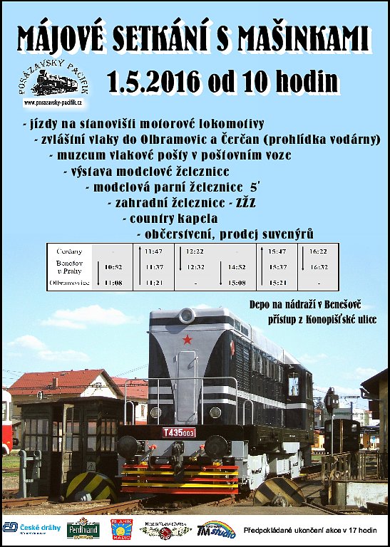 Akce bude probíhat 1.5. od 10 hodin v prostorách benešovského vlakového depa a bude pořádána spolkem Posázavský Pacifik. Upozornění pro návštěvníky, přechod přes kolejiště je přísně zakázán, přístupová cesta od nádraží do depa vede přes most!